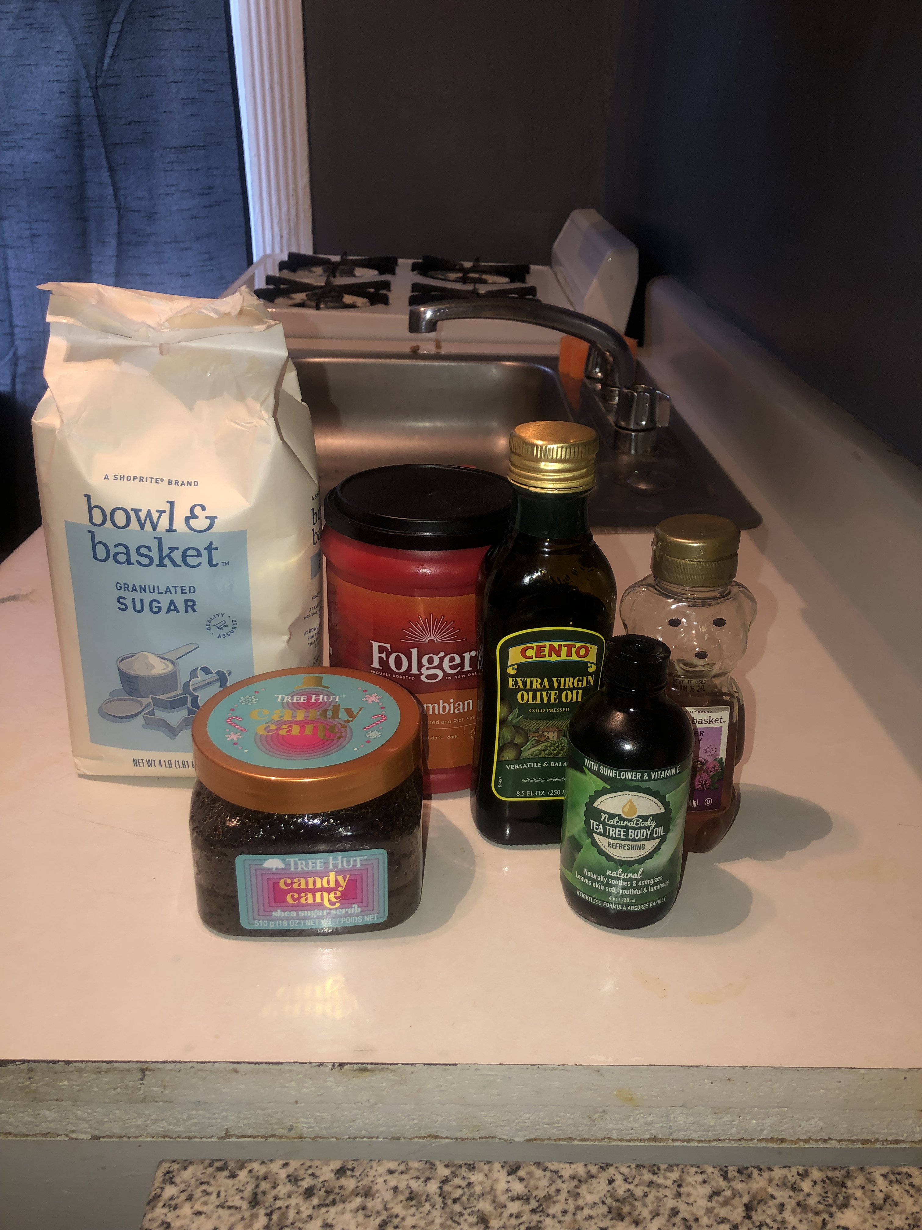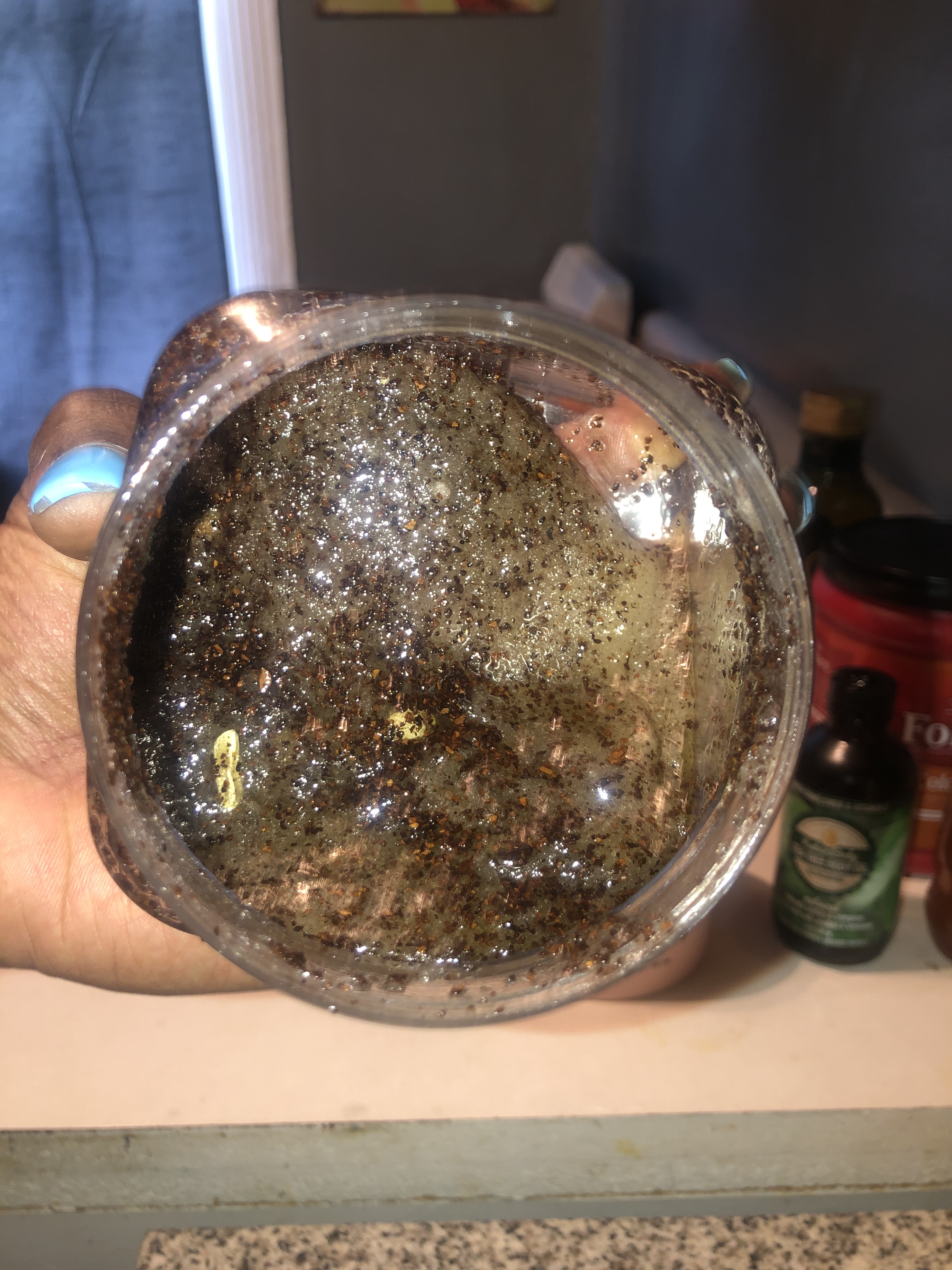 Here’s my homemade body scrub made with all the food items mentioned above. I was able to add as much sugar and coffee as I like to get the texture that I needed. My skin felt amazing after using it. I prefer my homemade scrub over my store bought one because mine is way more coarse.